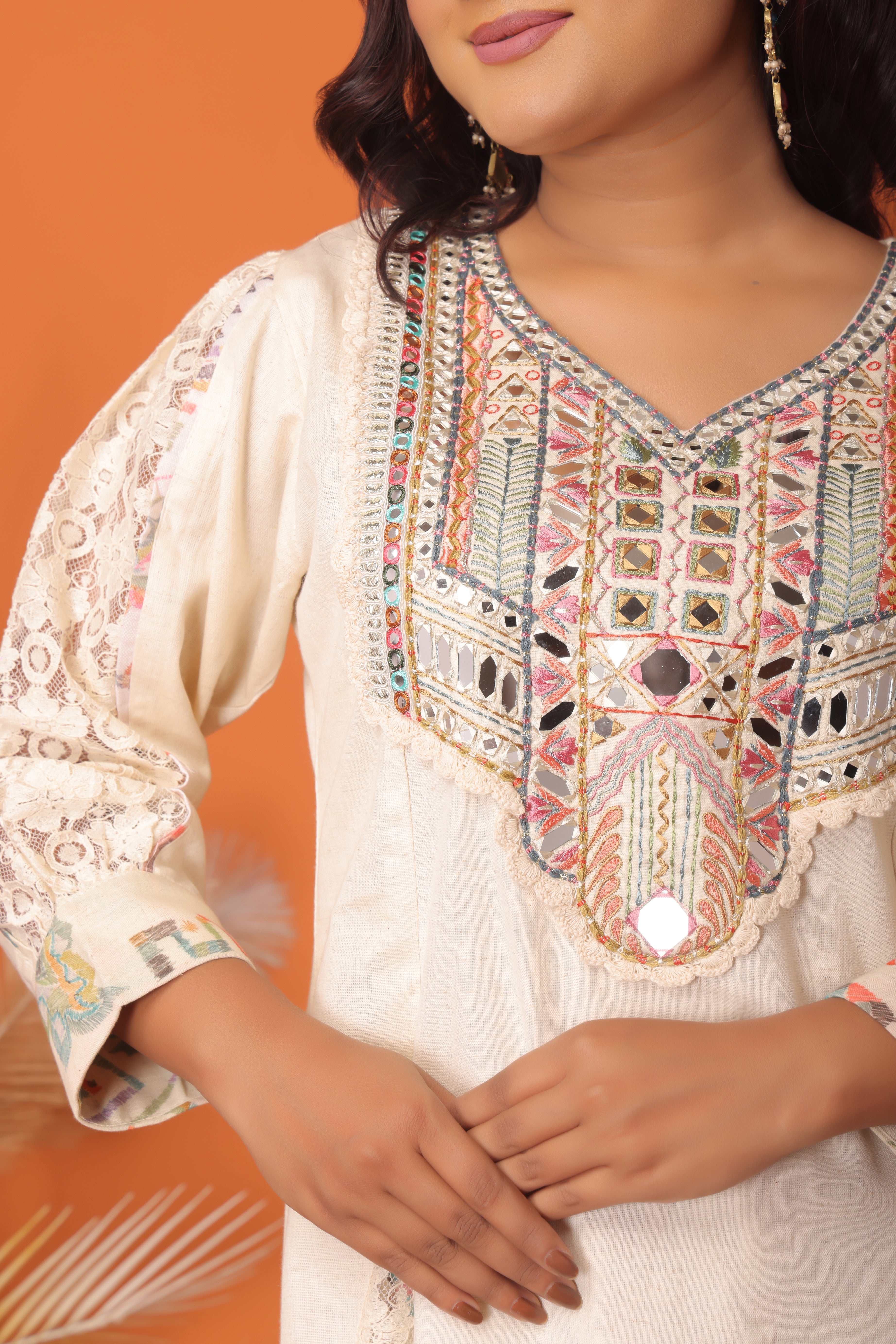Kurta Style: A-line silhouette with intricate multicolor embroidery on the neckline